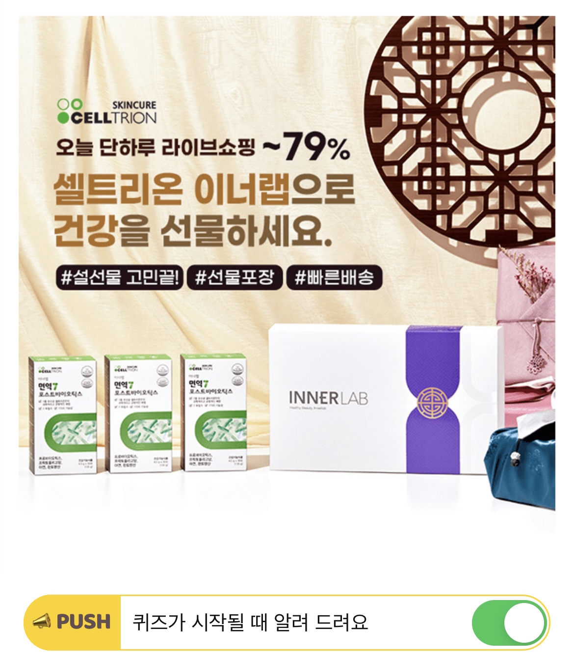 오늘 단하루 혜택! OOOO 이너랩 네이버 라이브방송에서는 설특집으로 깨끗한 식물성 그린오메가, 특허7종 유산균 면역7 포스트바이오틱스 등 다양한 건강선물세트를 단하루 특가로 진행합니다. OOOO에 들어갈 단어는 무엇일까요?