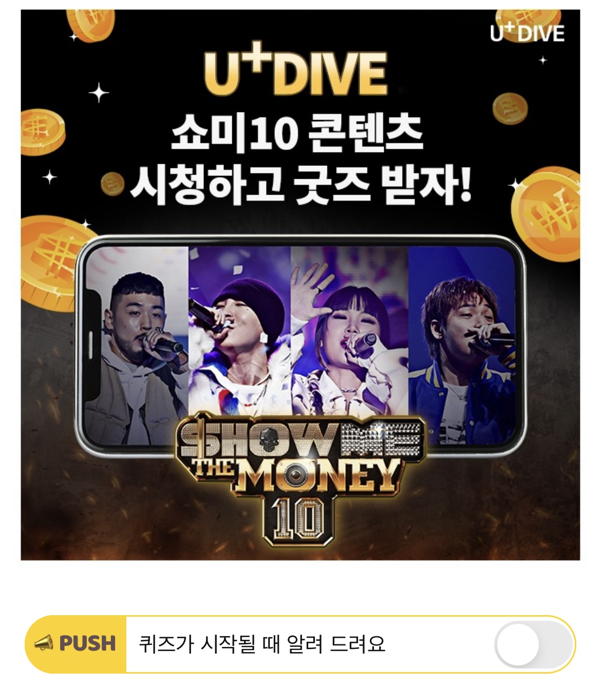 U+DIVE 앱의 쇼미더머니10 2차 시청 이벤트의 종료일은 2월 OO일 입니다.