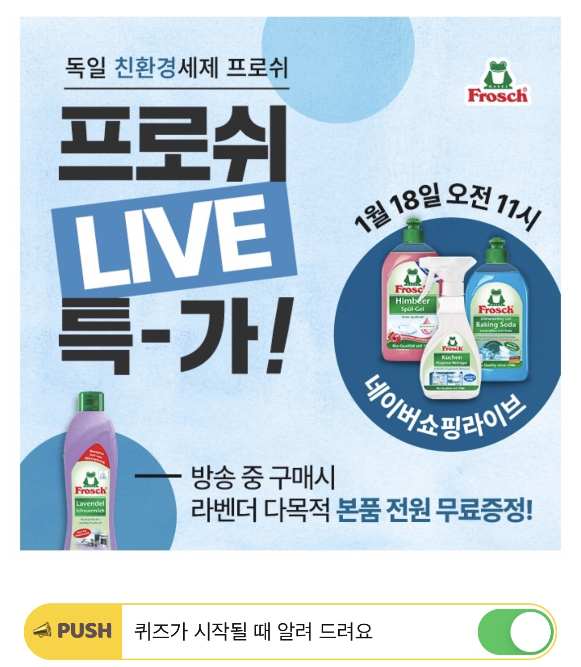 맨손 설거지 주방 세제로 유명한 독일 친환경 개구리 세제 프로쉬에서 설 명절 OO OO고민을 해결해 드리기 위해 라이브 방송 시간 동안 프로쉬 제품을 구매하면 라벤더 다목적 세제 본품을 전원 무료 증정합니다!