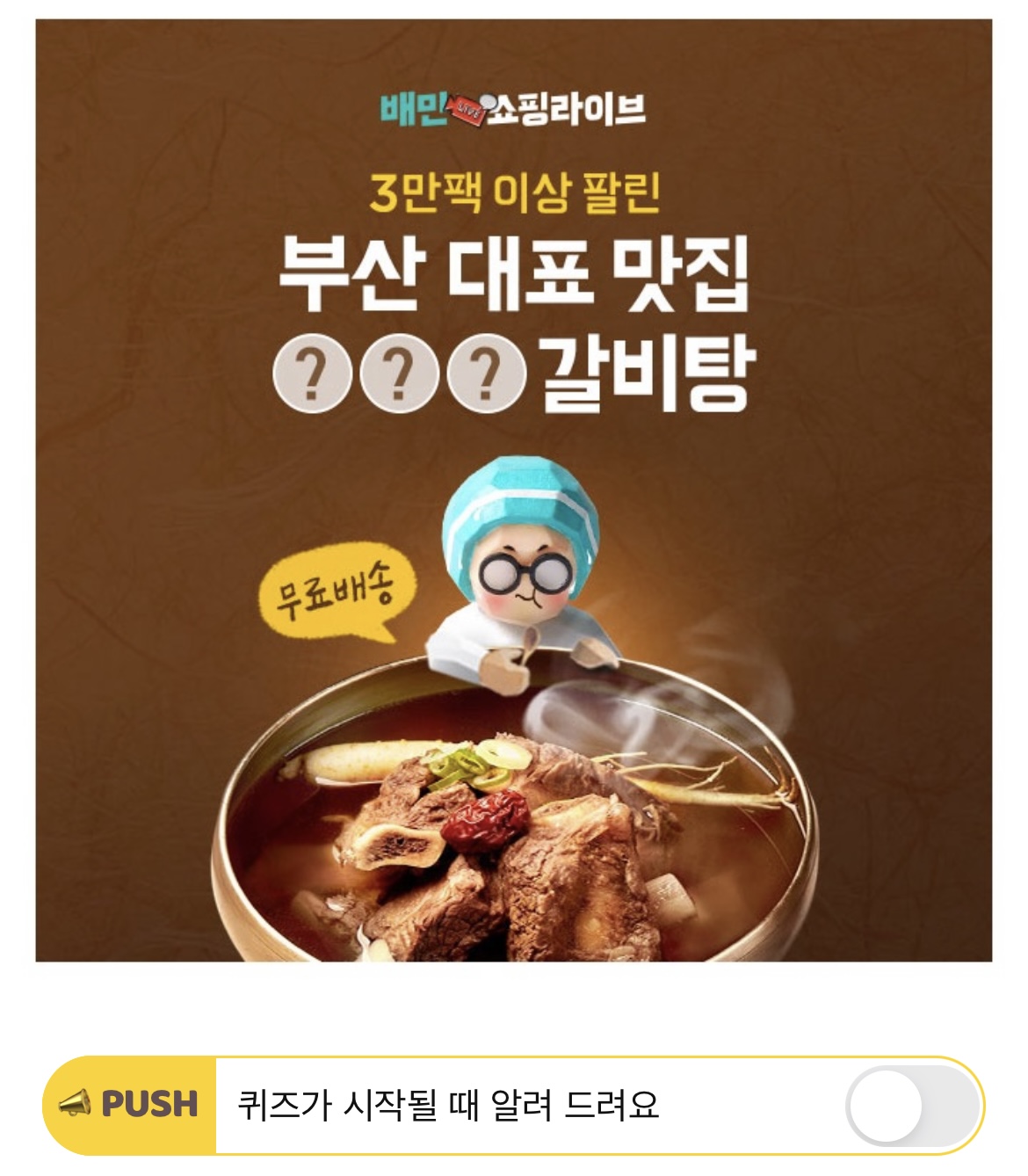 진짜 갈비로 우려낸 전통 갈비탕! 부산 대표 맛집 ㅇㅇㅇ갈비탕이 초특가로 찾아왔어요! 3만팩 이상 팔린 검증된 맛! OOO에 들어갈 말은 무엇일까요?