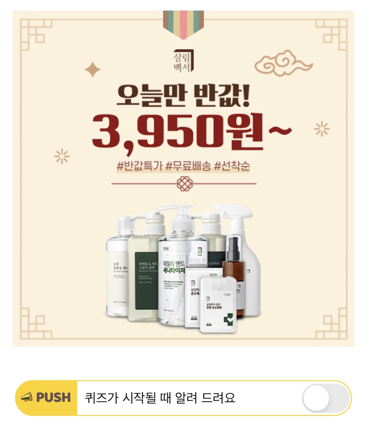 욕실에 꼭 필요한 필수템! 깨끗하게 손을 씻을 수 있는 핸드워시 본품과 리필, 텁텁함 없이 깔끔한 치약으로 구성된 선물세트 욕실살림 2호는 쿠폰 적용 시 OOOOO원으로 부담없이 선물하실 수 있는데요. OOOOO는 얼마일까요?