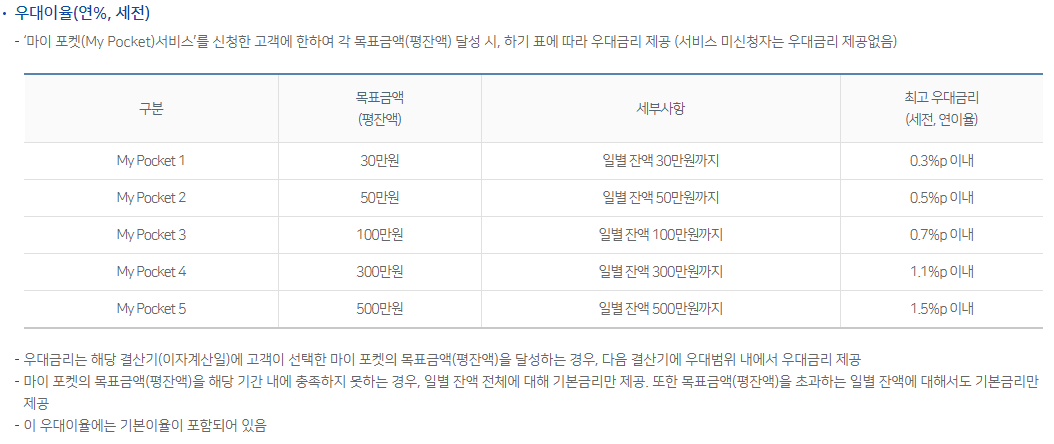 -마이 포켓서비스를 신청한 고객에 한하여 목표금액(평잔액) 달성시, 하기 표에 따라 우대금리 제공(서비스 미신청자는, 우대금리 제공없음)