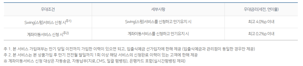 - 아래 우대요건을 충족하고 만기해지하는 경우, 아래에서 정한 우대이율을 각각 적용하여 기본이율과 합산하여 제공