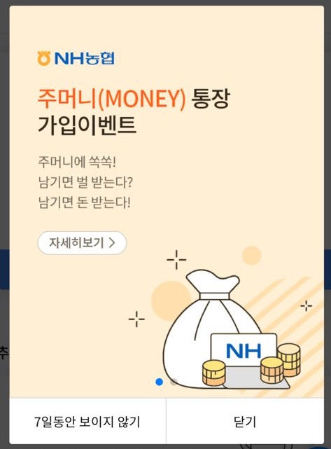 NH모바일 뱅킹으로 들어가면 이벤트 팝업이 하나 있습니다.