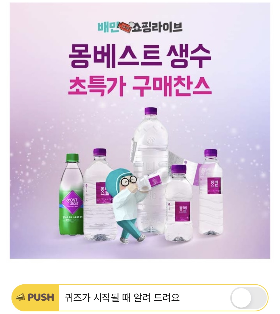 생수 필요하신 분? 지금이 득템 기회! 오늘 배민쇼핑라이브에서 몽베스트 2L 12병을 ㅇㅇㅇㅇ원에 드려요! 1병에 600원대인 오늘의 특가! ㅇㅇㅇㅇ원은 얼마일까요?