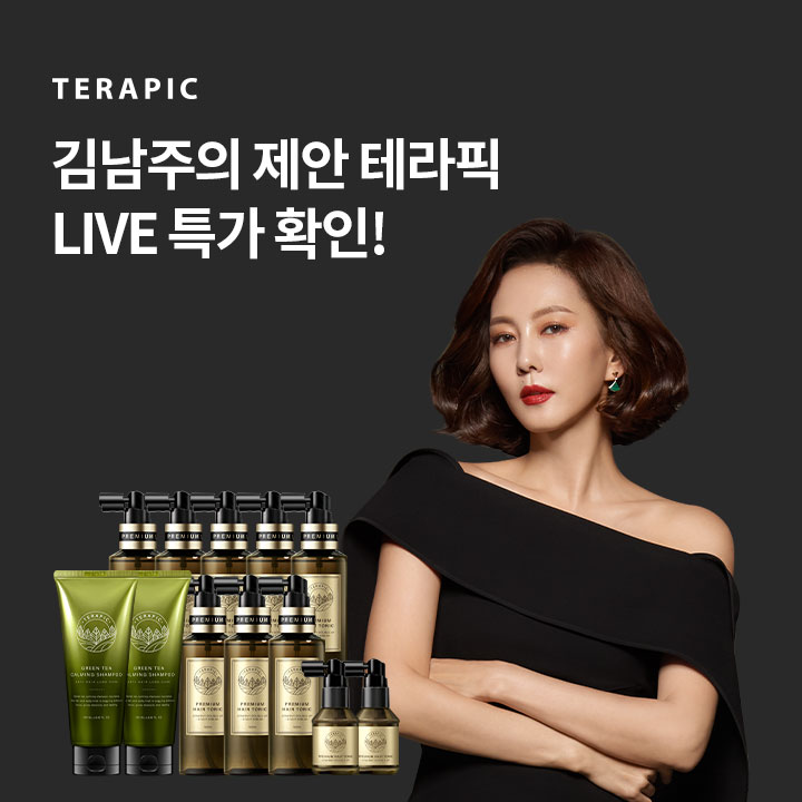문제 : 김남주도 선택한 두피케어 아이템 테라픽 OOOO은 지금 CJ 홈쇼핑에서 본품 8개+중용량 2개+그린티 카밍샴푸 2개 구성으로 라이브 중이다.
