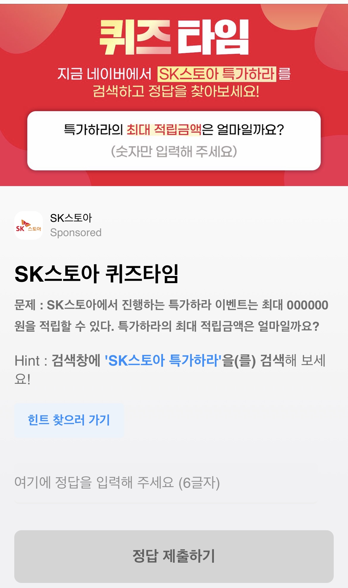 문제 : sk스토아에서 진행하는 특가하라 이벤트는 최대 000000원을 적립할 수 있다. 특가하라의 최대 적립금액은 얼마일까요?
