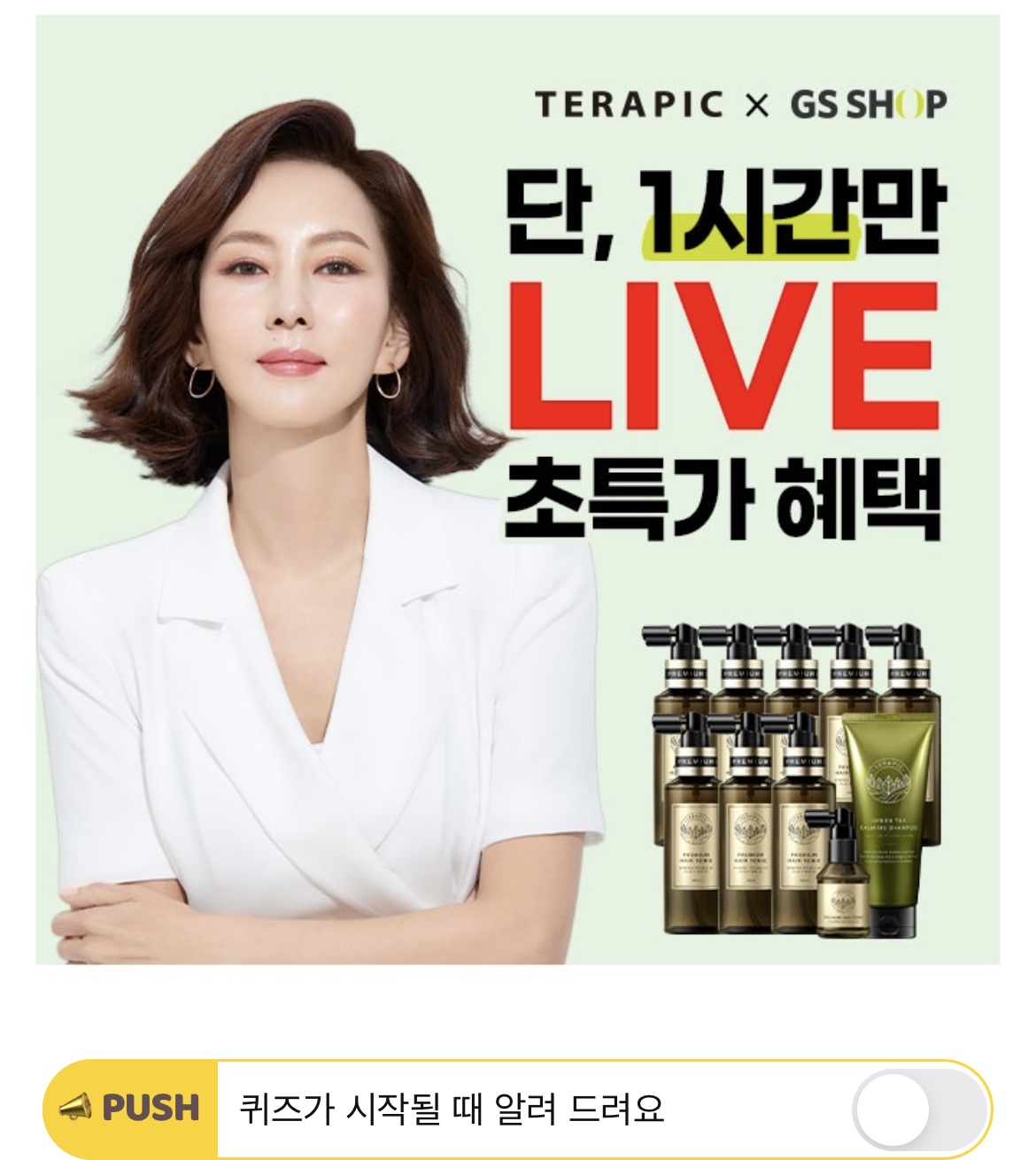 씻어낼 필요 없이 뿌려서 흡수시키기만 하면 돼서 간편 두피 관리템으로 사랑받고 있는 테라픽 두피세럼! 지금 GS 홈쇼핑에서는 게스트 OO님과 함께 테라픽 두피세럼 특별구성 라이브가 진행되고 있는데요. 현재 출연중인 게스트 OO은 누구일까요? (힌트 : ㅎㅇ)