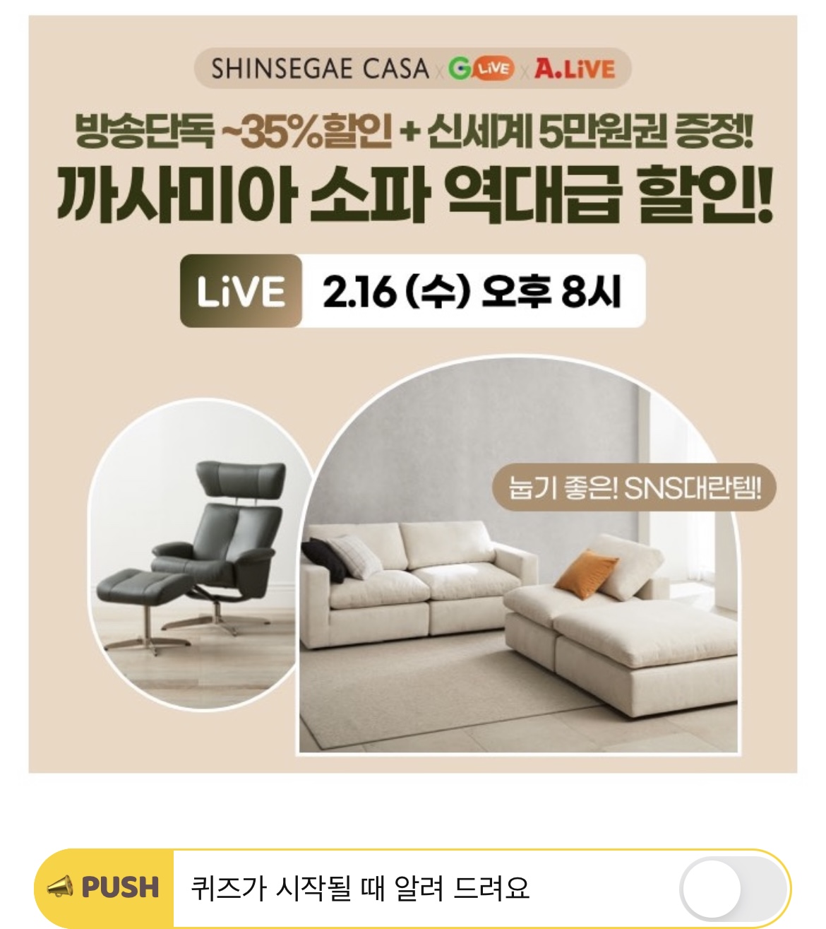 SNS대란! 입소문대란! 눕기 좋은 까사미아 소파가 디지털 OOOOO 방송에서 역대급 할인이라며?! 여기서, OOOOO에 들어갈 단어는 무엇일까요? (힌트 : ㄱㄱㅂㅅㅇ)