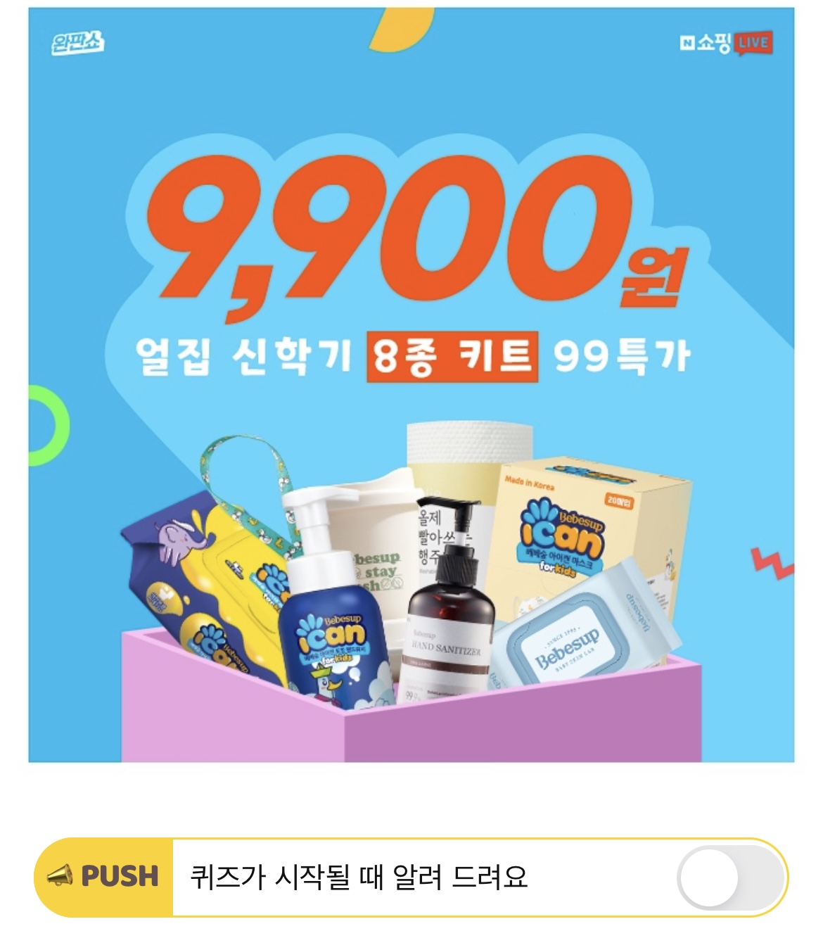 바나나차차! 바나나차차! 오늘 완판쇼 8화에서는 OOOOO을 대비한 라이브로 뽀로로파크에서 진행됩니다! 필수 준비물인 빨대컵, 스티커, 식판, 물티슈, 로션과 함께 뽀로로파크 티켓도 최저가로 판매된다고 해요! 깜짝 오픈되는 반값 상품과 9,900원 신학기 키트, 무료 맘박스까지 잊지 마세요~ 빈칸에 들어갈 단어는 무엇일까요? (힌트 : ㅇㅈㅈㅂㅁ)