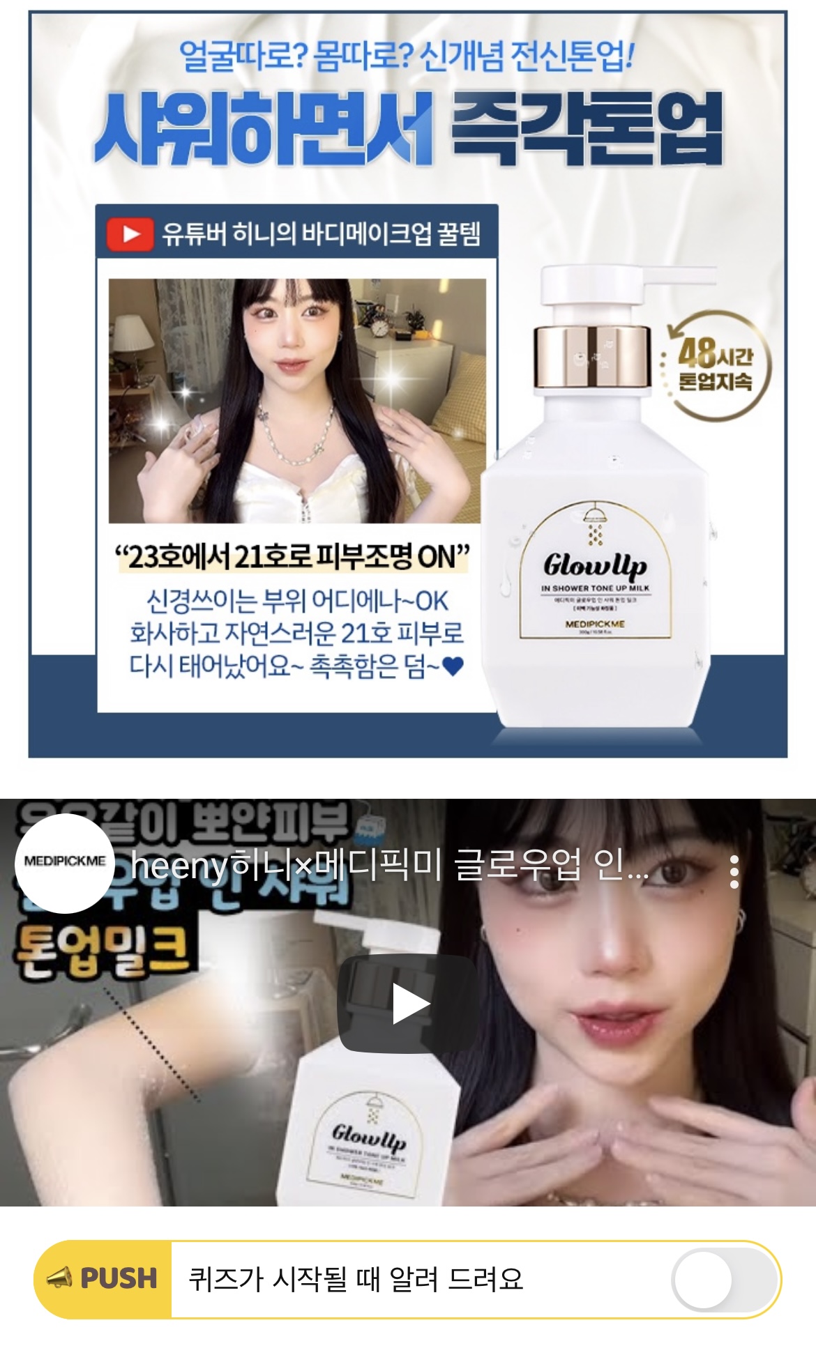 국내는 물론 해외까지 휩쓸고 다시 돌아온 메디픽미 글로우업 인샤워 톤업밀크! 메디픽미 톤업밀크는 샤워 후 바르고 씻어내면 즉각적인 톤업효과가 나타는 제품으로, 바른 후 최대 OO시간 톤업 지속이 된다고 합니다. OO시간 톤업 지속으로 임상테스트까지 완료한 메디픽미 톤업밀크! 톤업밀크 사용 후 뽀얀 우유빛 피부는 몇 시간 동안 지속 될까요?