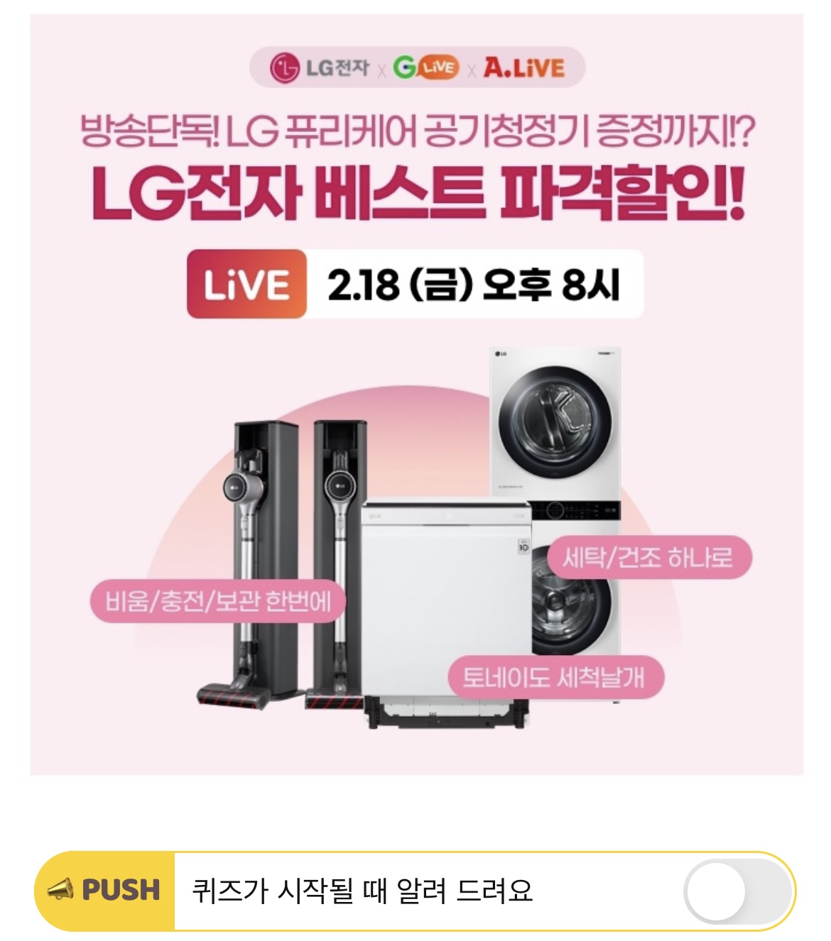 Glive 디지털가구빅세일 특집 라이브 'OOOO'편에서 세탁기/청소기/식기세척기 역대급 최저가라며? 여기서, OOOO에 들어갈 단어는 무엇일까요?