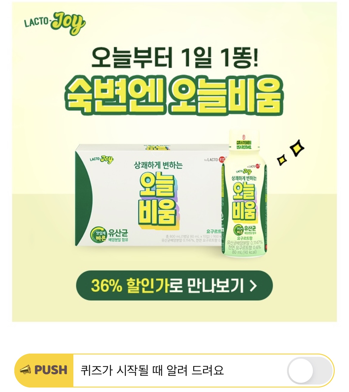 매일 아침이 상쾌하게 변하는 락토조이 오늘비움은 80ml 용량으로 가볍고, OOOO맛으로 맛있게 즐기실 수 있습니다. 여기서 OOOO에 들어갈 단어는 무엇일까요?