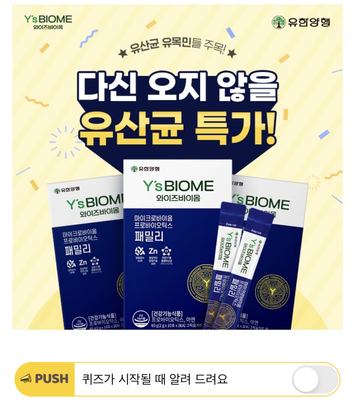 유한양행 유한양행 와이즈바이옴은 비피더스균과 유산균을 OO% : OO%의 비율로 배합하였습니다.