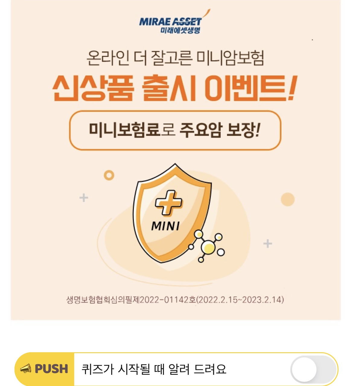 신상품! 미래에셋생명 온라인 더 잘고른 미니암보험! 암보험이 있어도 중복보장이 가능한 이 상품은, 미니보험료로 남성/여성 주요암 OO종이 보장됩니다! OO에 들어갈 숫자는 무엇일까요?