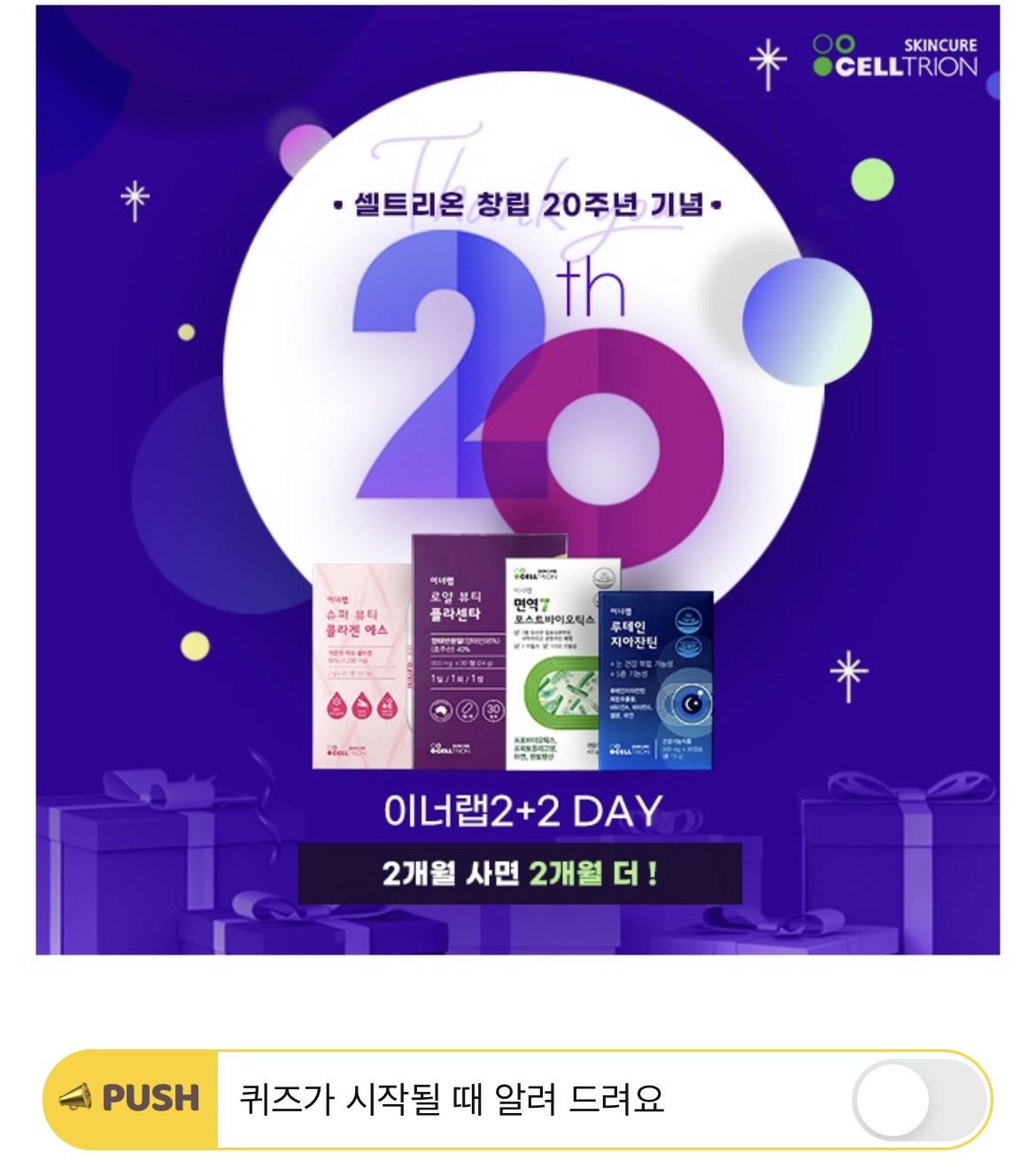 생일축하합니다~ 생일축하합니다~ 셀트리온 OO번째 생일을 축하합니다! 셀트리온 OO주년을 맞이하여 이너랩에서 크게 한 턱 쏩니다! ★2개월 사면 2개월 더!★ 특가 기회 놓치지 마세요! OO에 들어갈 숫자는 무엇일까요?