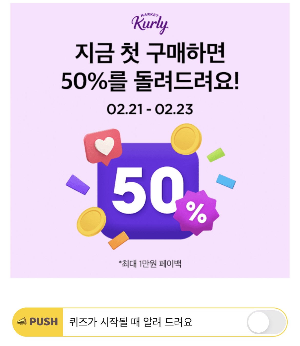 마켓컬리 50% 페이백 이벤트는 최대 'O'만원까지 지급됩니다. 'O'에 들어갈 숫자는 무엇일까요? (숫자만 입력)
