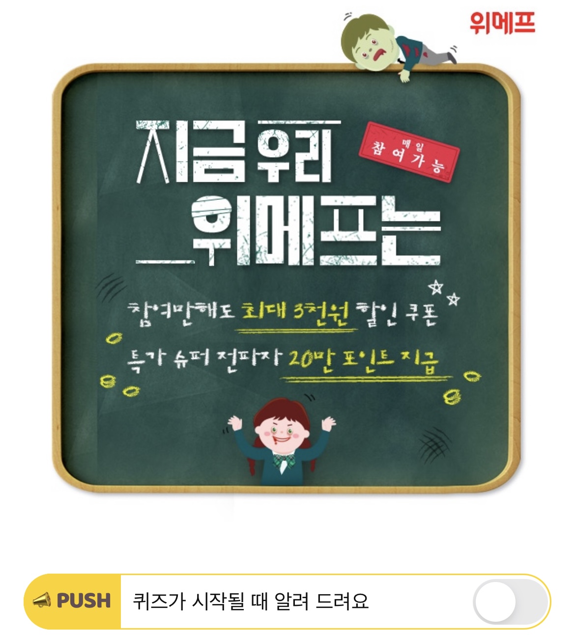 지금 우리 위메프는 이벤트에서는 오전/오후 11시에 선착순 반짝 쿠폰이 열립니다. 한정수량 OOOO명으로 알람 설정은 필수입니다! 빈칸에 들어갈 숫자는 무엇일까요?