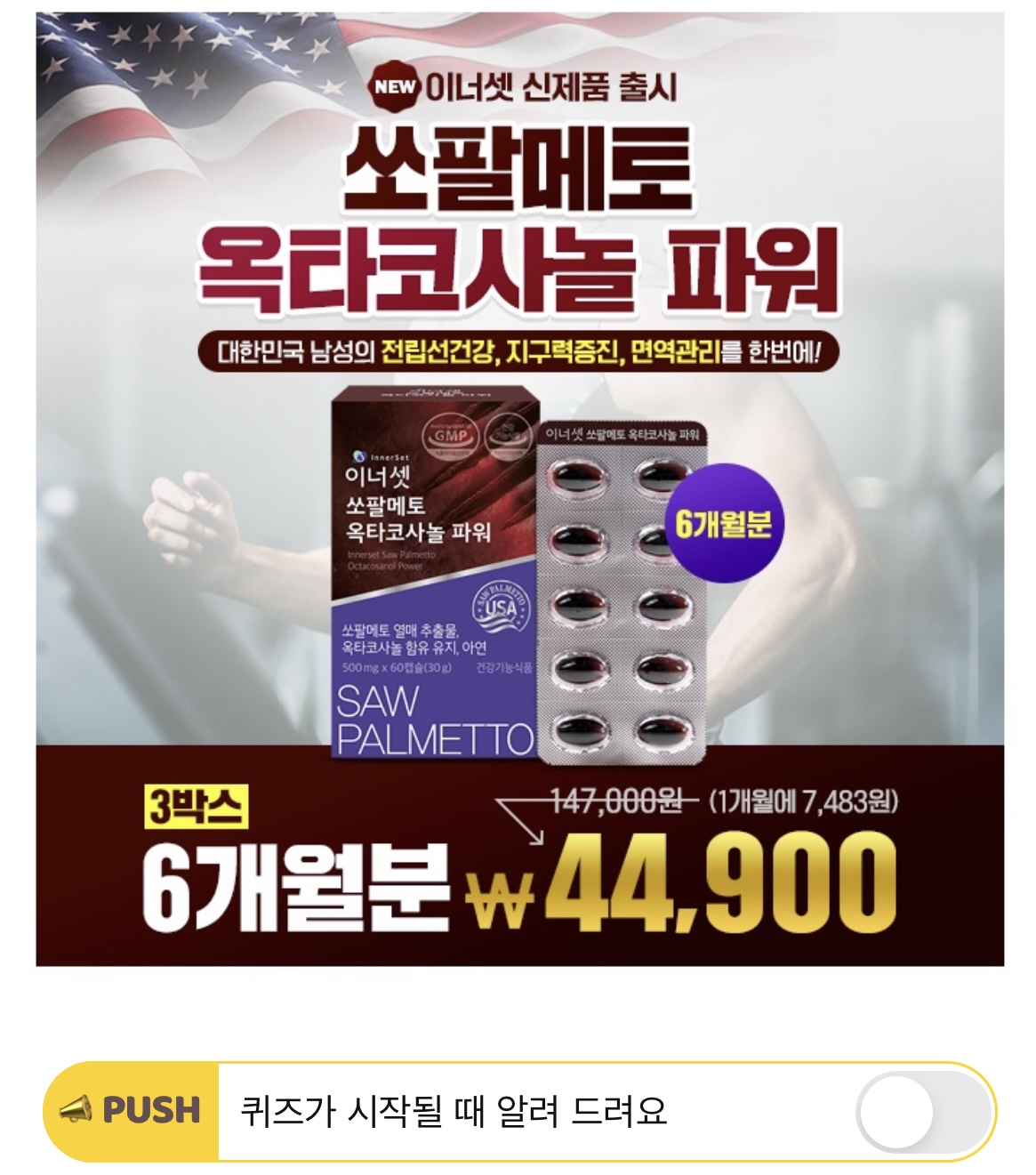 이너셋 쏘팔메토 옥타코사놀 파워는 대한민국 남성의 전립선건강, 지구력증진, 정상적인 면역기능에 도움이 되는 제품으로 100% OOO쏘팔메토 열매 추출물을 사용하였습니다. 여기서 OOO는 무엇일까요? (초성힌트 : ㅁㄱㅅ)