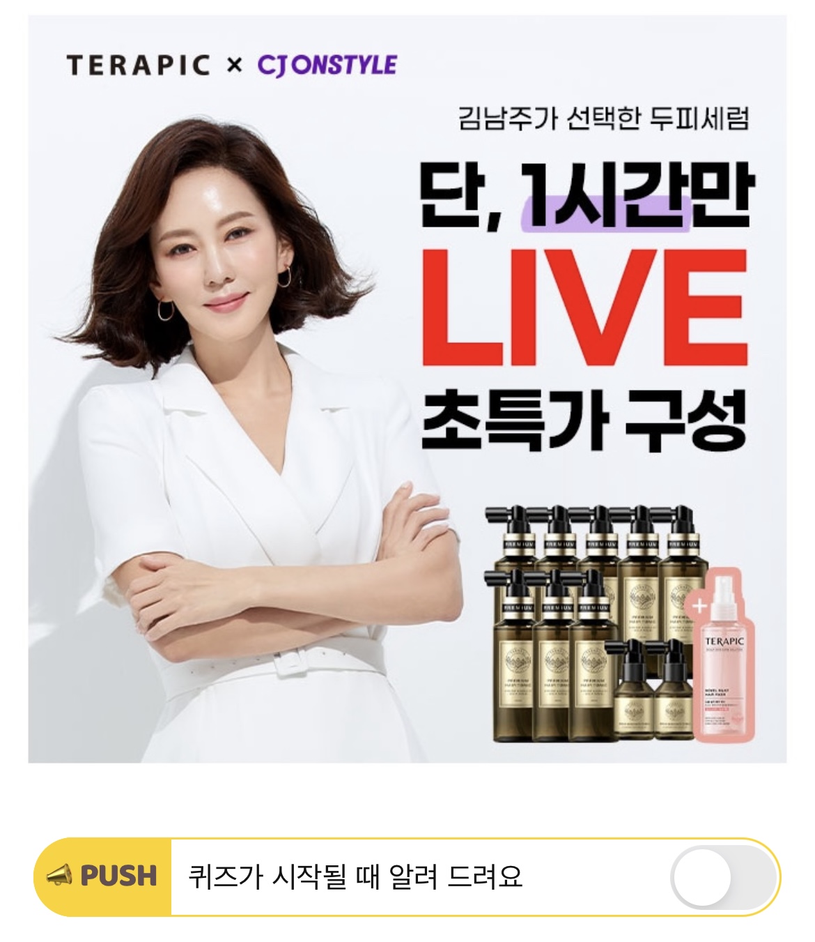 지금 CJ 횸쇼핑에서는 테라픽 특별구성 라이브가 진행되고 있습니다. 이번 구성에는 테라픽에서 새롭게 선보인 OOOO 헤어픽서가 포함 되었는데요. 여기서 빈칸에 들어갈 단어는 무엇일까요? (힌트 : ㄴㅂㅅㅋ)