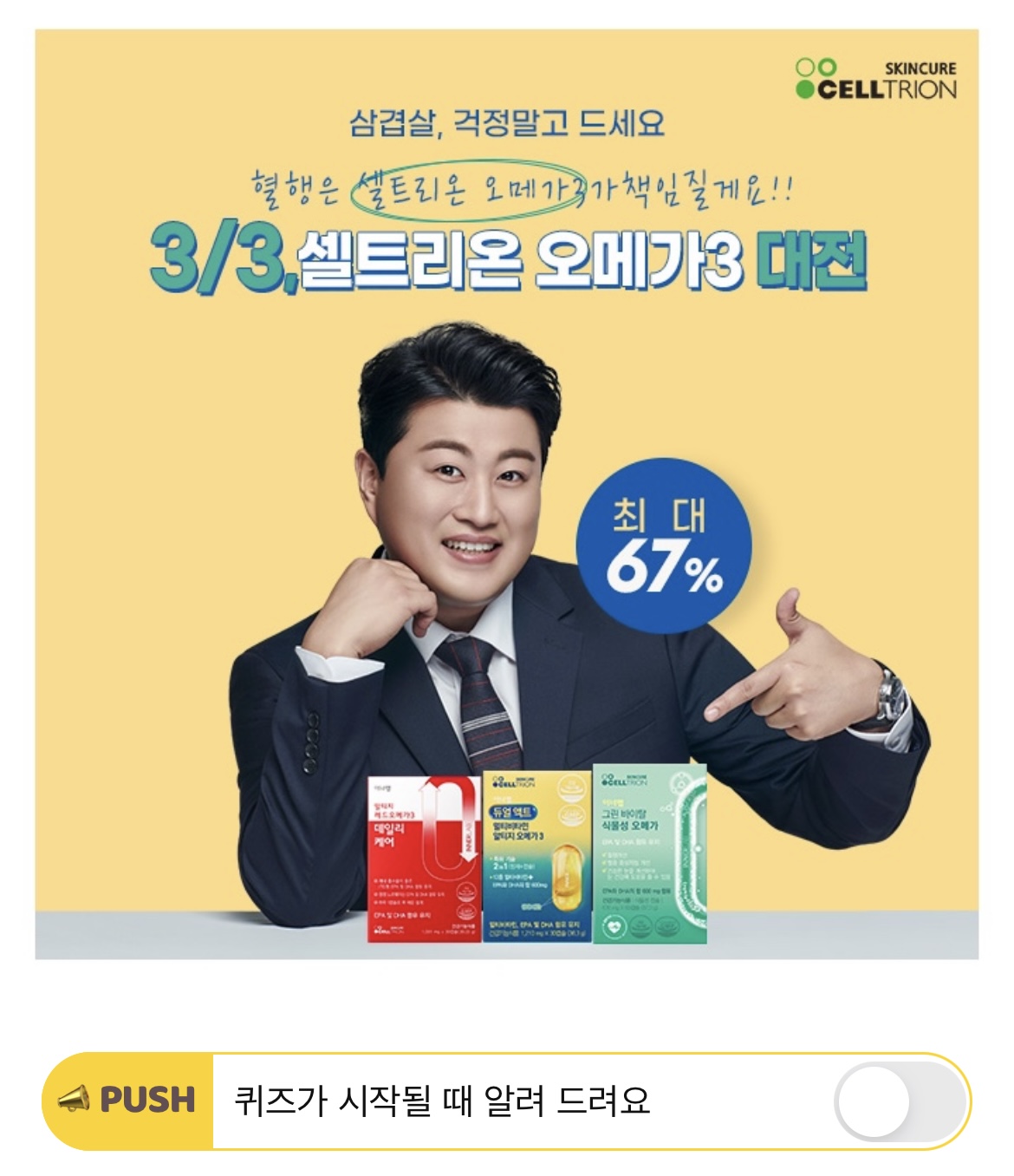 셀트리온 이너랩의 베스트셀러가 돌아왔다! 원료부터 캡슐까지 100% OOO으로 더욱 안전하고 깨끗한 '그린 바이탈 OOO 오메가' 채식주의자도 안심하고 섭취 가능한 그린컬러의 OOO 캡슐 사용! 남녀노소 모두 안전하게 섭취하세요 OOO은 무엇일까요? (초성 힌트: ㅅㅁㅅ)