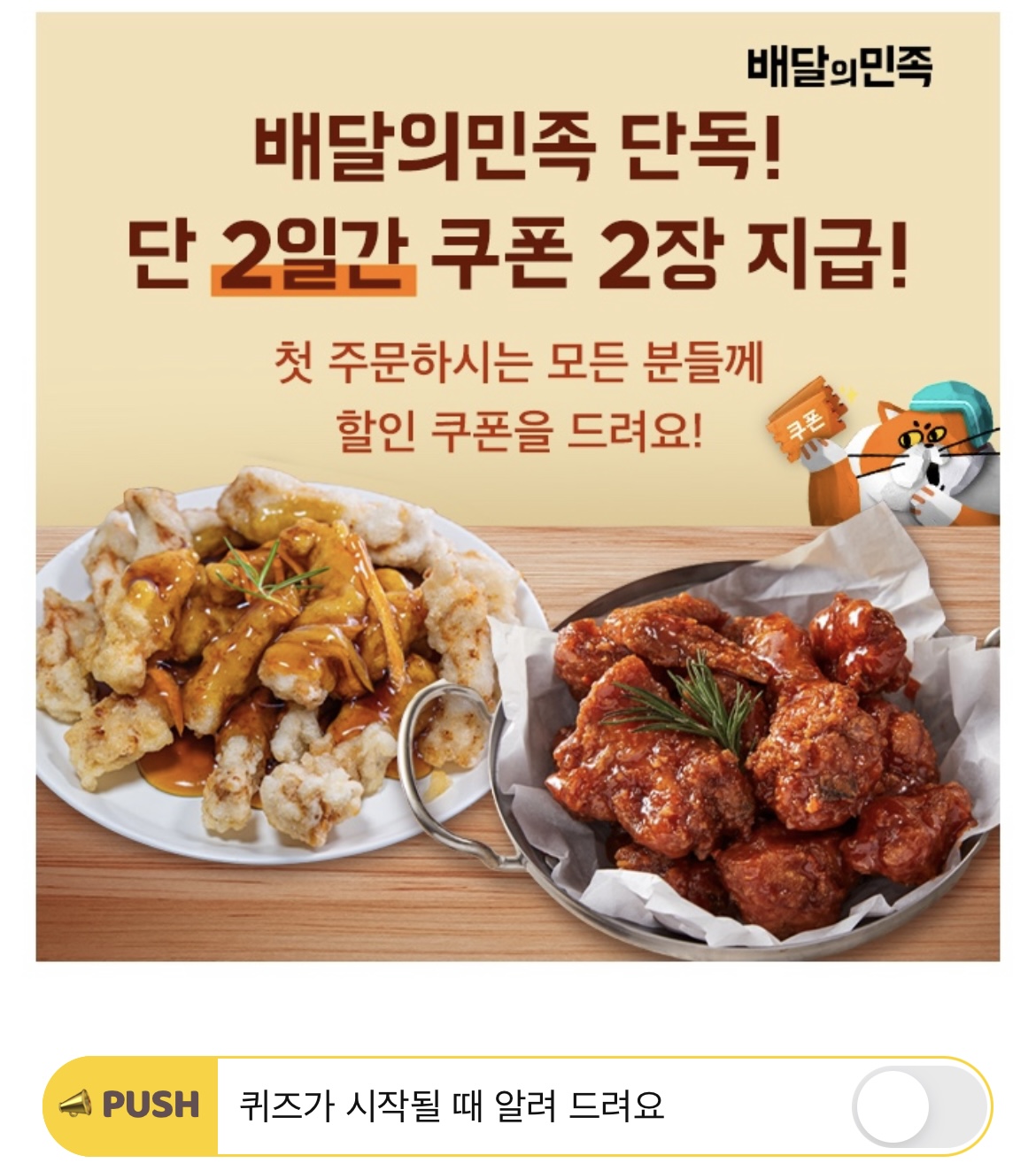 단 이틀! 배달의민족 첫 주문하면 총 OOOOO원 쿠폰을 모든 고객님들께 드립니다!