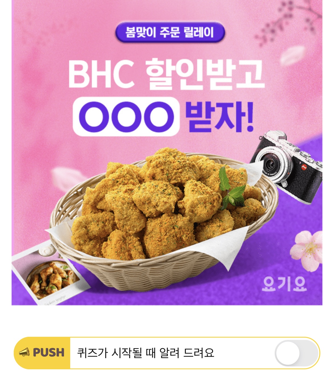 지금 요기요에서 봄맞이 주문 릴레이 이벤트에 참여하면 추첨하여 봄날에 쓸 카메라 상품을 드려요. 추가로 11일부터 13일까지는 BHC OOOO원 할인 행사도 진행됩니다.