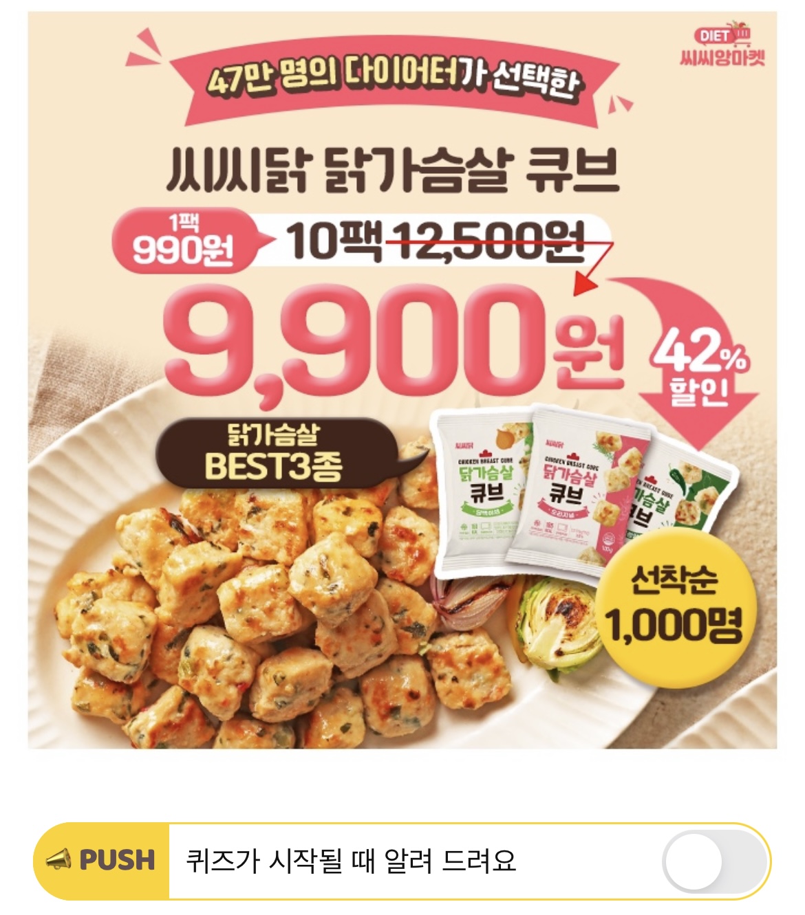 "계속 재주문하고 있네요. 당뇨인 아빠를 비롯해 모두에게 간편한 한 끼 식사와 간식으로 매우 사랑 받고 있어요. 꾸준하게 챙겨 먹으니 다이어트에도 도움 됩니다." 이 내용은 두툼한 큐브에 한 입 가득 퍼지는 OO, 차원이 다른 닭가슴살을 경험할 수 있는 씨씨닭의 후기입니다. OO은 무엇일까요?