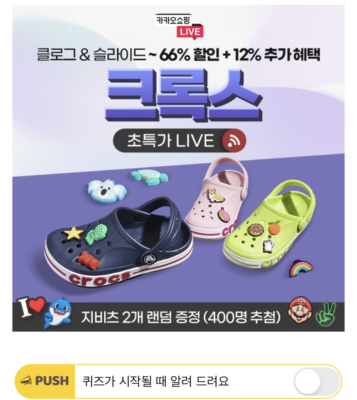 오늘 카쇼라X크록스 라이브에서는, 최대 66% 상품할인, 추가 7% OOOO, 지비츠 추첨 등의 혜택을 누릴 수 있습니다. OOOO에 들어갈 단어는 무엇일까요?