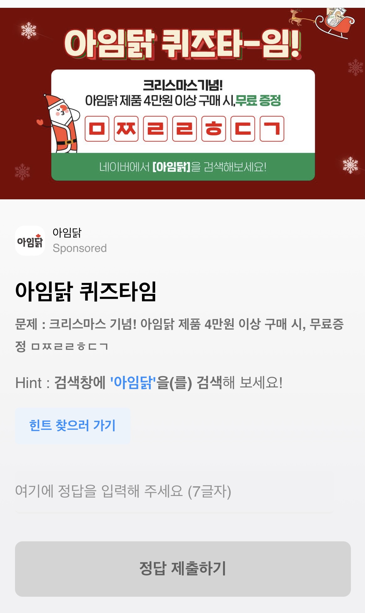 문제 : 크리스마스 기념! 아임닭 제품 4만원 이상 구매 시, 무료증정 ㅁㅉㄹㄹㅎㄷㄱ