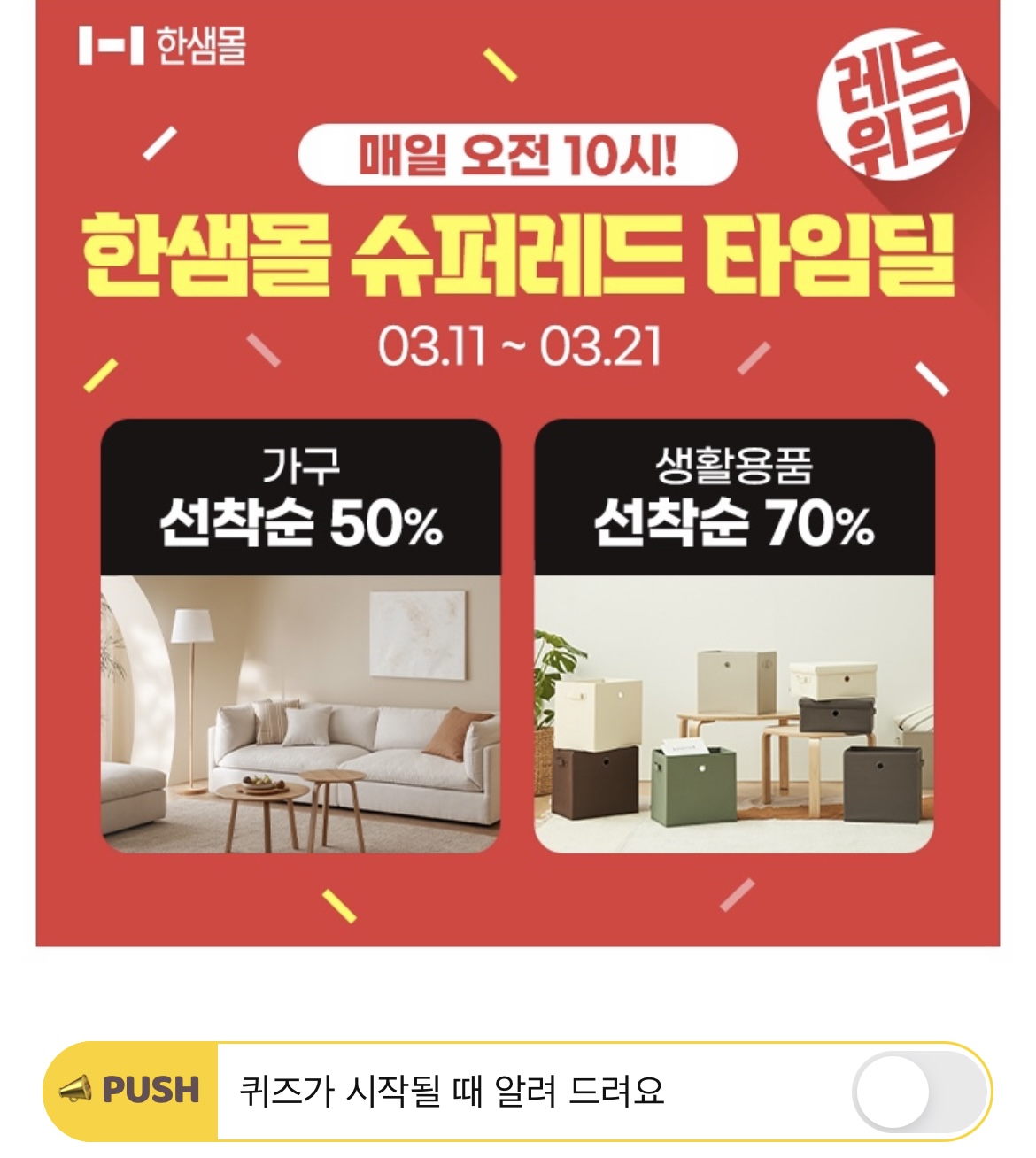 3월 21일까지! 단 11일간 진행되는 한샘몰 상반기 최대혜택 위크 OOOO에서는 각종 특가 상품을 만나볼 수 있습니다. 빈칸에 들어갈 단어는 무엇일까요? (힌트 : ㄹㄷㅇㅋ)