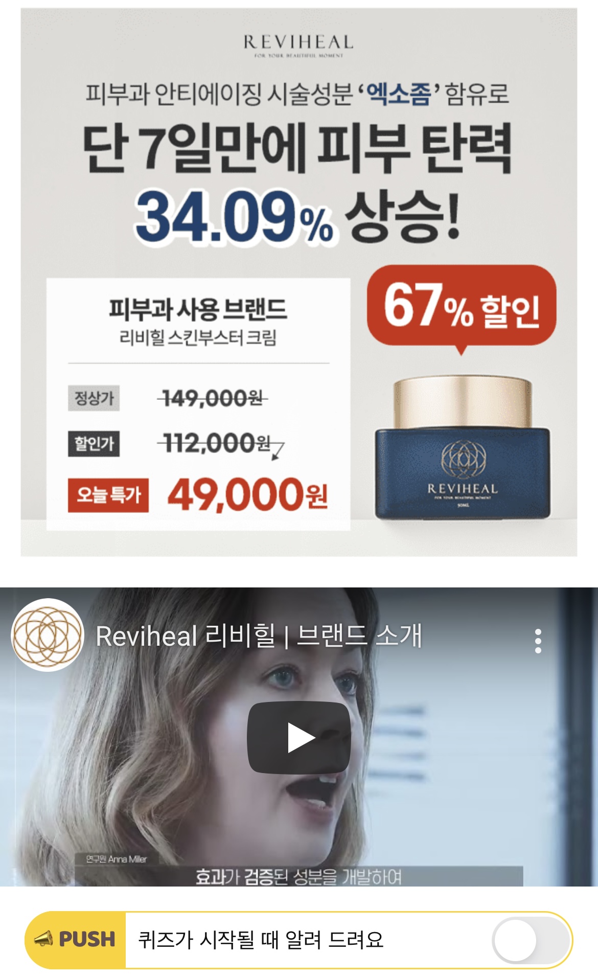 ★오늘만 67% 할인★"환절기로 하루하루 변하는 피부 컨디션에 와, 이렇게나 좋아져도 되나 싶을정도로 OOO 넘치고 물광 좌르르한 피부표현을 가져다주니 리비힐만 써야되나 싶을정도." 위 내용은 피부과에서 사용하는 안티에이징 크림인 리비힐 스킨부스터 크림의 실제 후기입니다. 빈칸에 들어갈 단어는 무엇일까요? (힌트 : ㅅㅂㄱ)