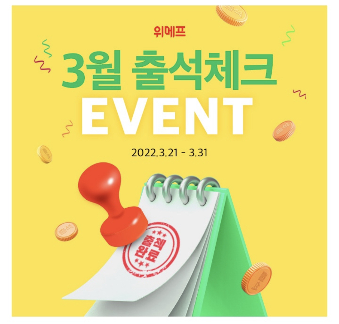 3월 4주차에는 매일 출첵하면 최대 1,550포인트! 3월 출석체크 이벤트 'OO! OOOOO!' 가 진행됩니다. 매일 50포인트씩 적립할 수 있는 이벤트 이름은 무엇일까요? (힌트 : ㄷㅈ ㅍㄹㅊㅊㄹ)