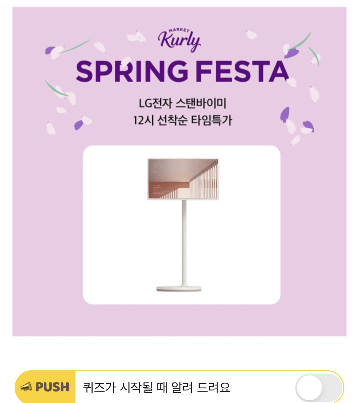 봄과 함께 찾아온 역대급 혜택! 마켓컬리 스프링 페스타 혜택 중 첫 번째 행운의 OOO이 매일매일 100% 당첨됩니다. 즉시 사용 가능한 OOO을 매일 받아가세요! 'OOO'에 들어갈 단어는 무엇일까요?