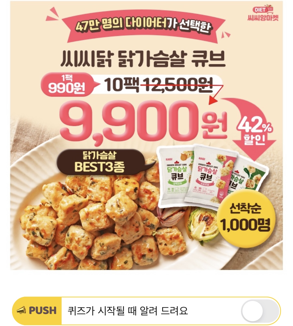 "이런 닭가슴살은 처음이에요! 타사 제품과 달리 한입 크기라서 먹기 편하고 부드러워서 너무 맛있게 잘 먹고 있어요" 이 내용은 46만 다이어터들이 가장 선호하는 세가지 맛에만 집중하여 불필요한 비용은 DOWN! OOO좋은 씨씨앙 마켓의 씨씨닭 닭가슴살 큐브의 후기입니다. OOO은 무엇일까요?