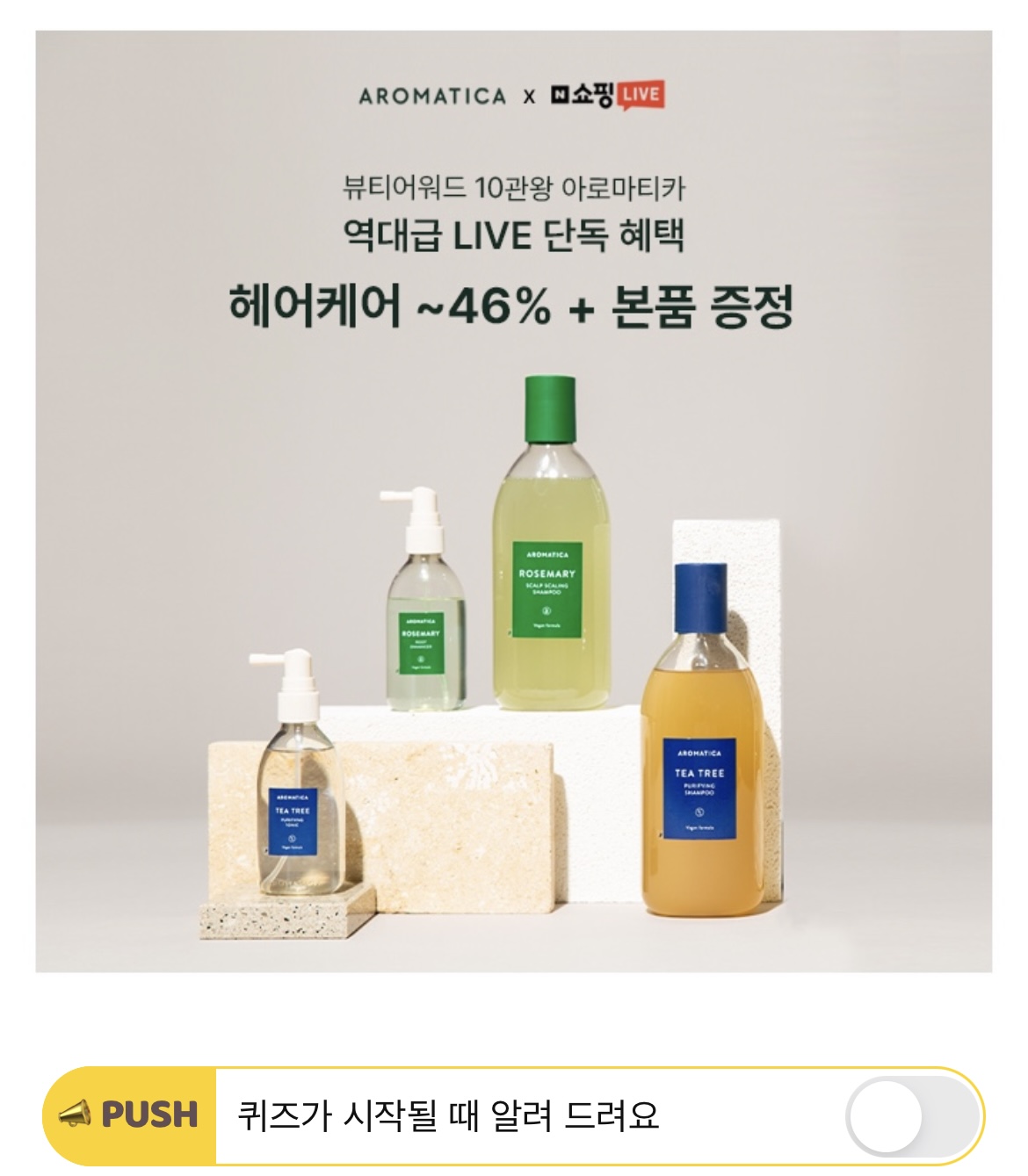 아로마티카 뷰티어워드 10관왕 축하 라이브방송 오직 생방송에서만!! 최대 46%할인가격으로 만나보세요. 대표상품 로즈마리/OOO샴푸 대용량 기획(2L구성) 파격세일 ! OOO에 들어갈 내용은 무엇일까요 ?(초성힌트 :ㅌㅌㄹ)