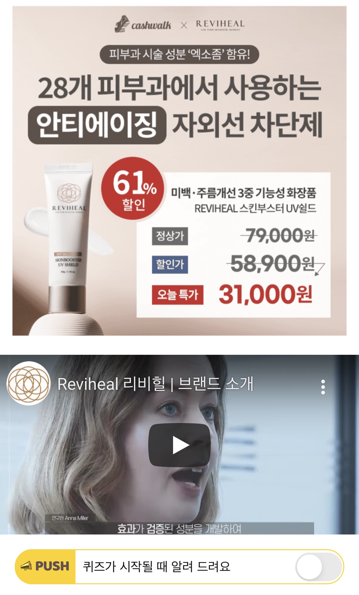 ★61% 할인★리비힐 스킨부스터 UV쉴드는 정제수 대신 진정에 도움을 주는 포트마리골드꽃수가 OO% 이상 함유가 되어 즉각적인 피부 개선이 가능합니다. OO에 들어갈 숫자는 무엇일까요?