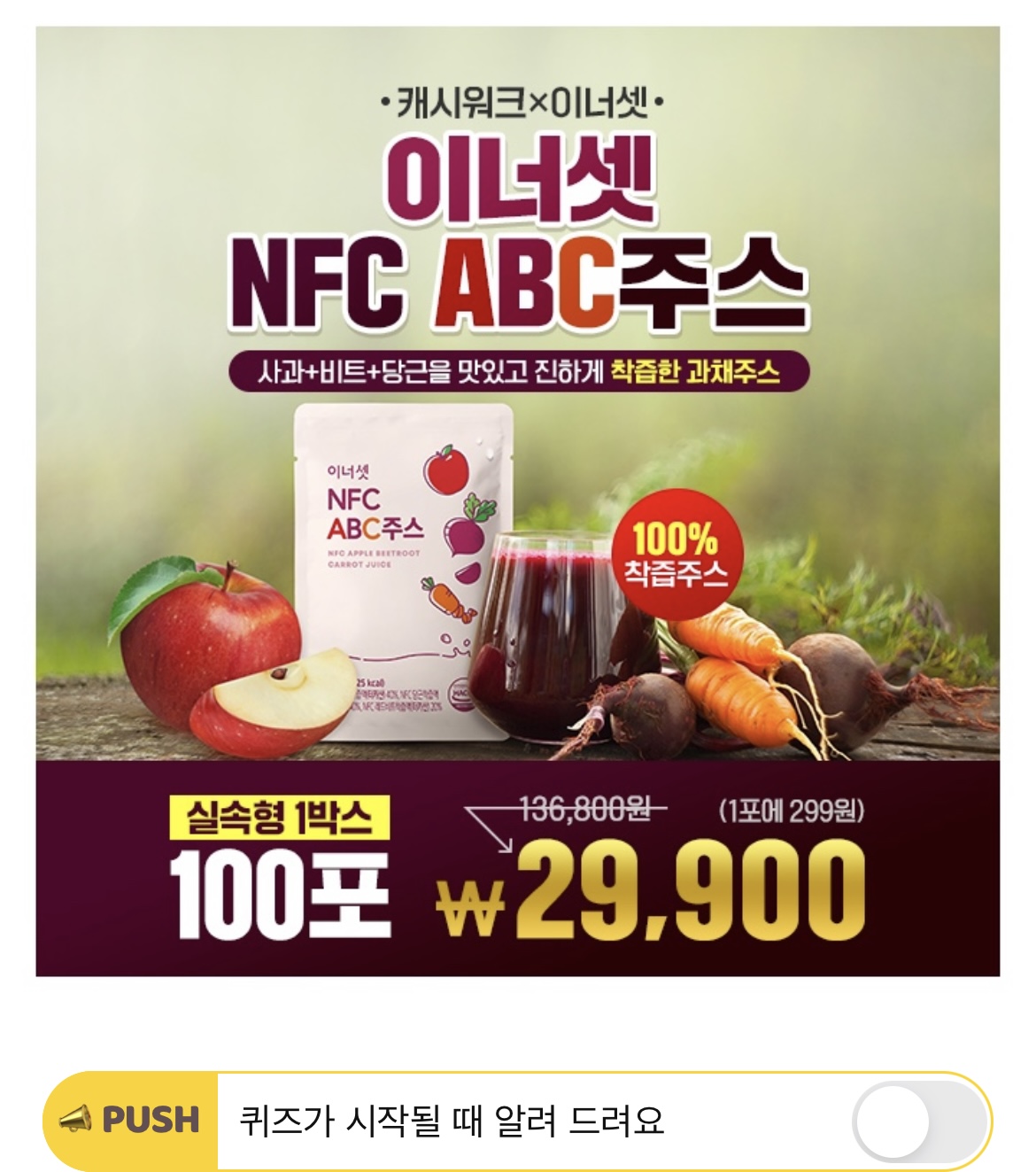이너셋 NFC ABC주스는 생과일을 OOOO으로 짜서 착즙하기 때문에 영양소 파괴없이 그대로 섭취할 수 있습니다. 여기서 OOOO은 무엇일까요??(초성힌트 : ㅇㅊㅂㅅ)