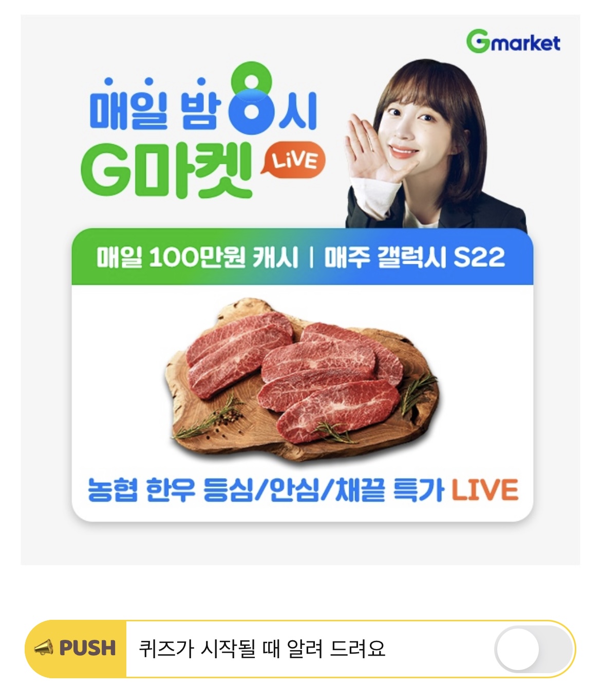 매일 밤 8시! 사상 최대 LIVE 혜택과 100만원 캐시, 매주 갤럭시s22까지 주는 G라이브! 오늘 밤 8시 방송 브랜드 OO OOOO은 무엇일까요?