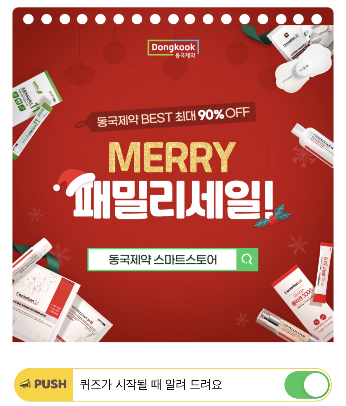 동국제약이 패밀리세일을 12/15~12/24일간 진행합니다. 동국제약은 올 해 마지막 패밀리세일을 기념해 다양한 이벤트, 마데카크림 3,900원 등 최대 OO% 할인율을 제공하고 있습니다. OO에 들어갈 숫자는 무엇일까요?