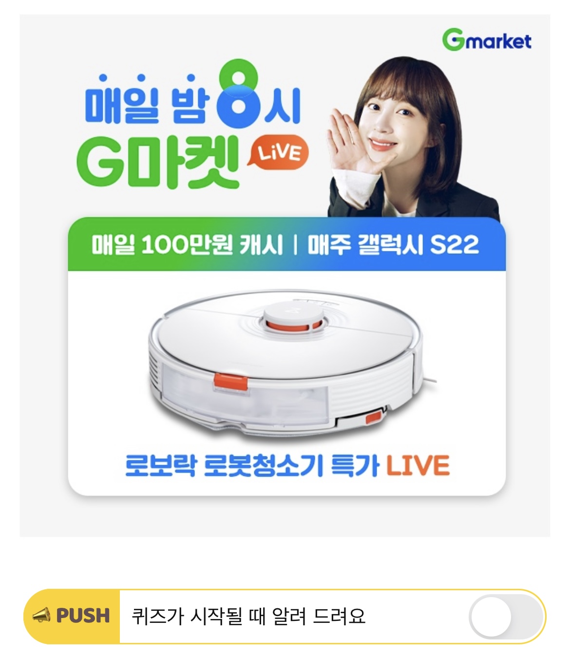 매일 밤 8시! 사상 최대 LIVE 혜택과 100만원 캐시, 매주 갤럭시s22까지 주는 G라이브! 오늘 밤 8시 방송 브랜드 OOO는 무엇일까요?