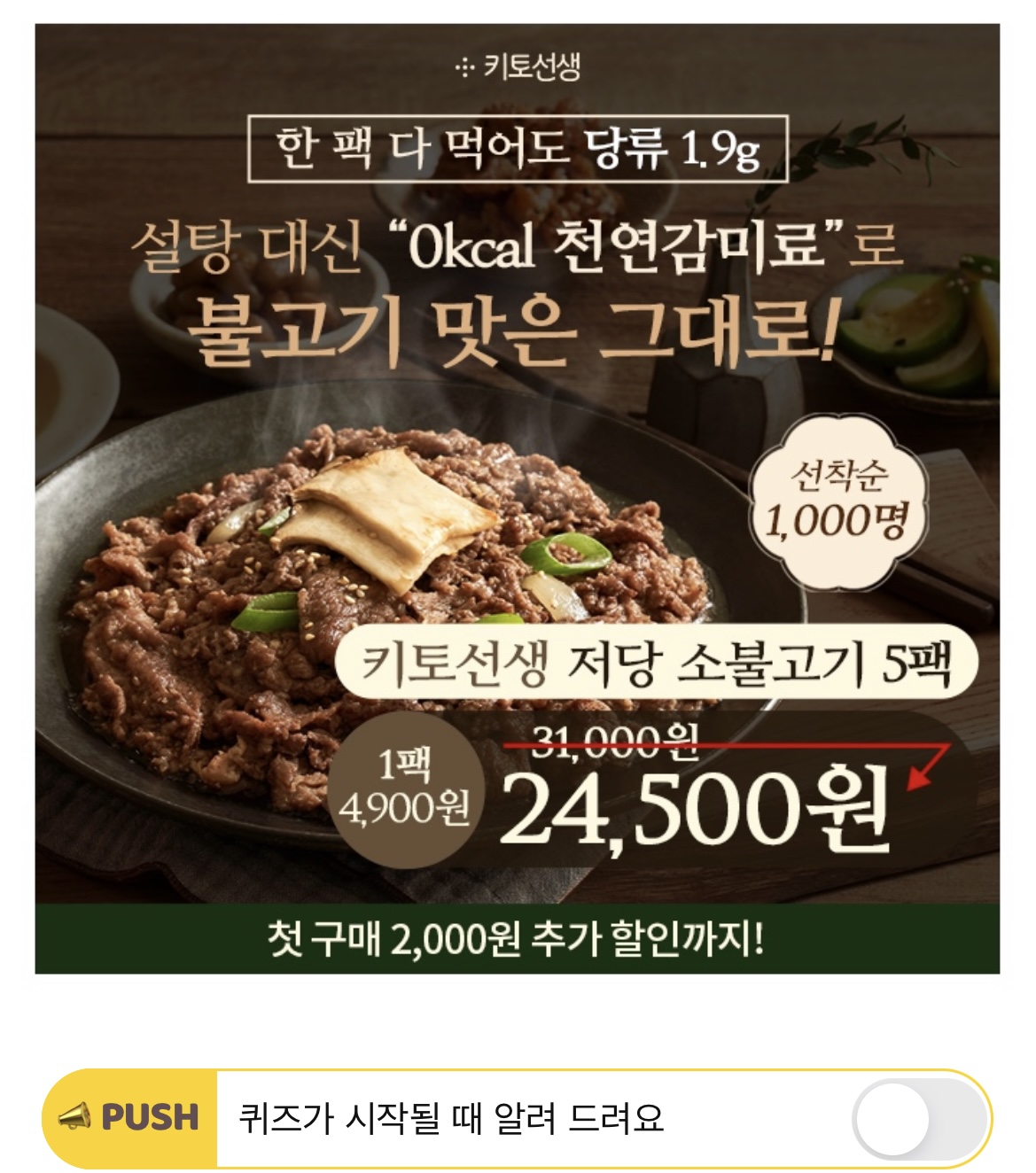 "식단관리하면서 입터질 때 야식으로 저당소불고기 먹었는데 체지방만 -5kg 빠졌네요~" 이 내용은 설탕대신 0kcal천연감미료로 깊은 양념맛은 유지하고 당류는 OO% 낮춘 저당소불고기 후기인데요, 현재 라이브 방송 중 구매 시 사은품을 드립니다! OO에 들어갈 숫자는 무엇일까요?