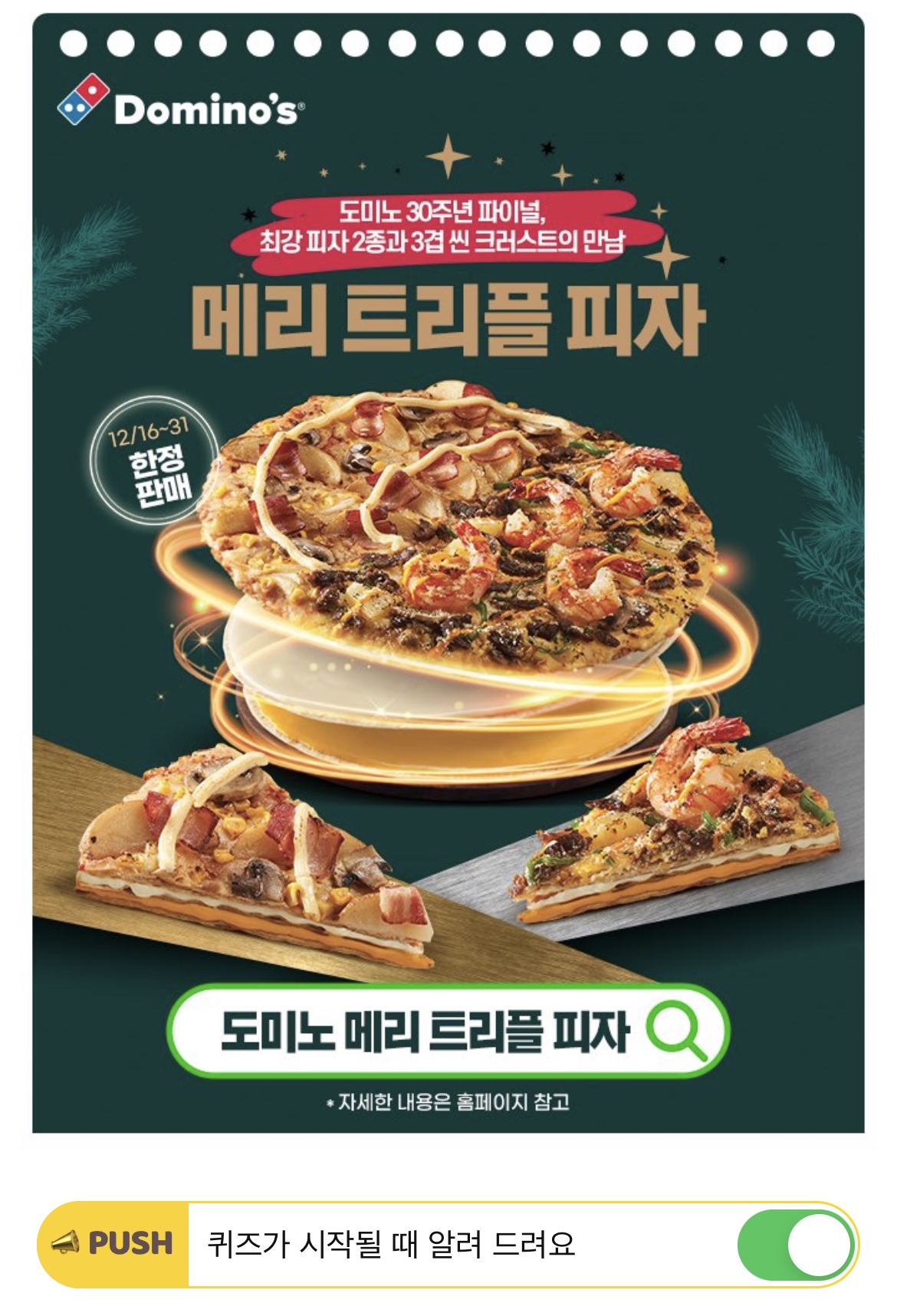 오늘부터 12월 31일까지, 온라인 매니아는 메리 트리플 피자 라지 사이즈 주문 시 OOO이 할인됩니다.