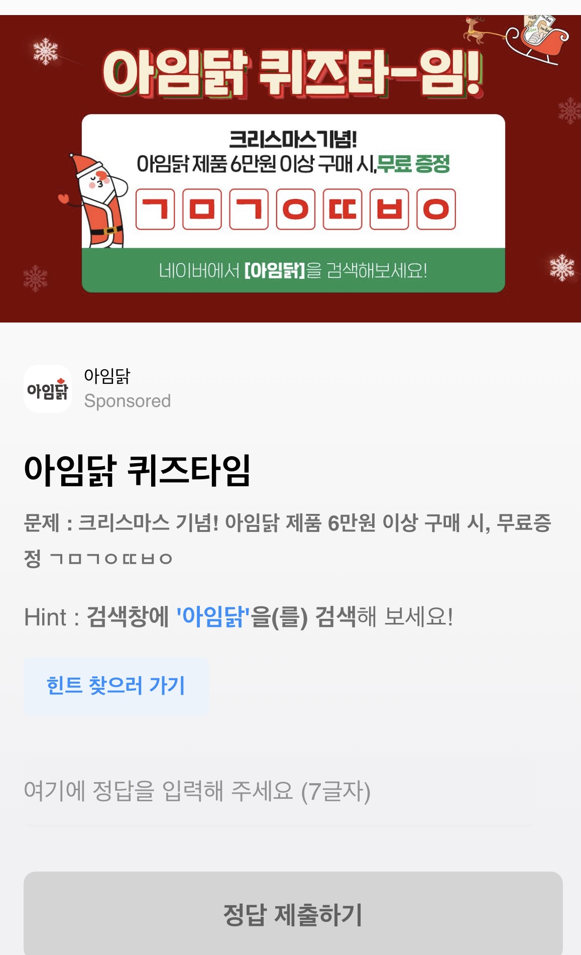 문제 : 크리스마스 기념! 아임닭 제품 6만원 이상 구매 시, 무료증정 ㄱㅁㄱㅇㄸㅂㅇ