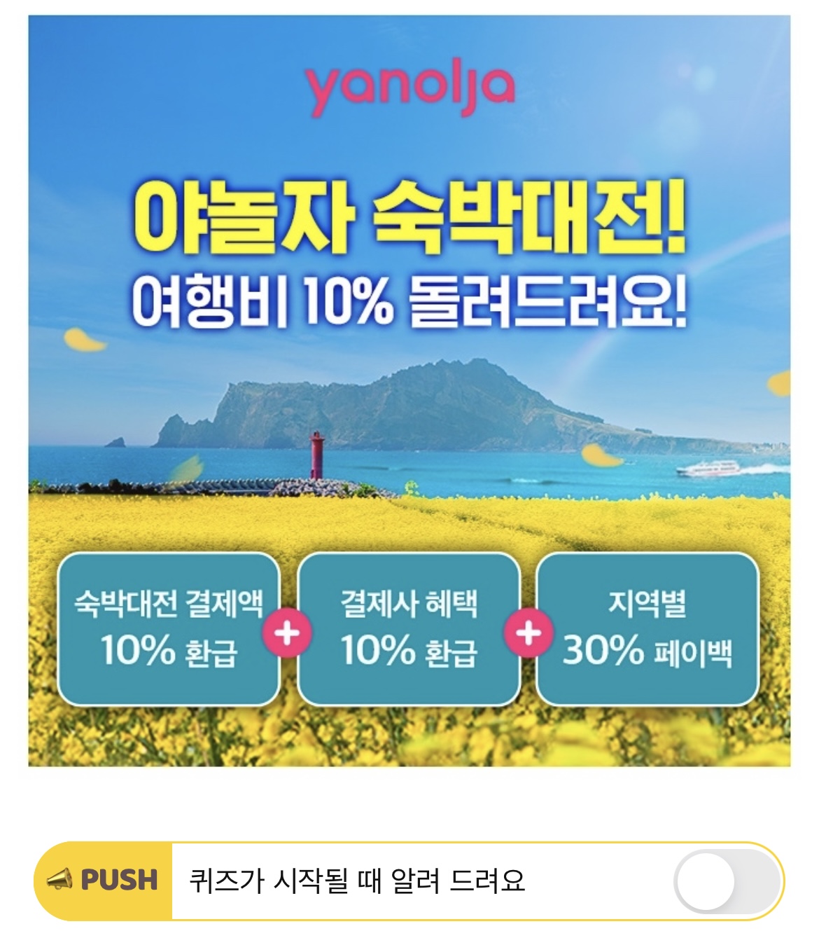 야놀자 숙박대전 최대 3만원 선착순 쿠폰! 매일 오전 10시, 대한민국 숙박대전 선착순 OOOO으로 봄 여행 예약하면, 야놀자가 여행비 10%를 돌려드립니다! 숙박대전 예약 고객 누.구.나. 10% 돌려드리는 기회! 그리고 최대 30% 결제혜택과 추가 제공 10% OOOO 쿠폰은 덤! 야놀자 역대급 혜택 놓치지 마세요!