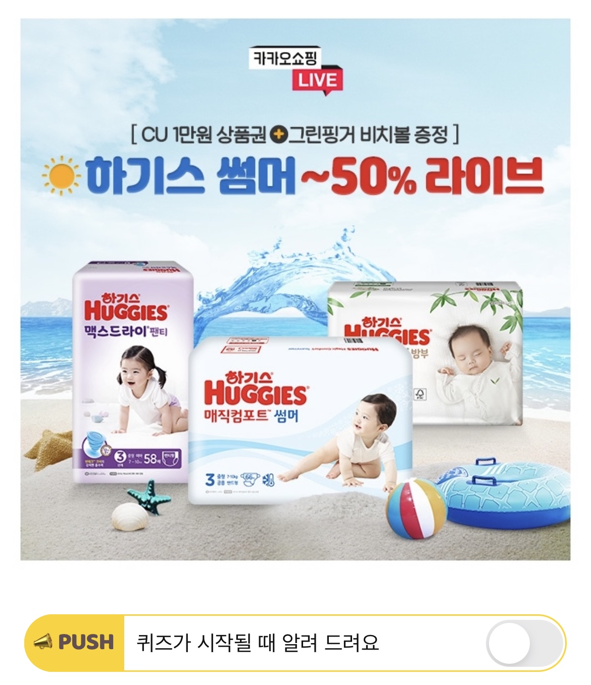 오늘 카쇼라 X 하기스 라이브에서는 매직OOO 썸머, 네이처메이드 썸머, 맥스드라이 기저귀 등을 최대 50% 할인가에 판매합니다. OOO 들어갈 단어로 알맞은 것은 무엇일까요?