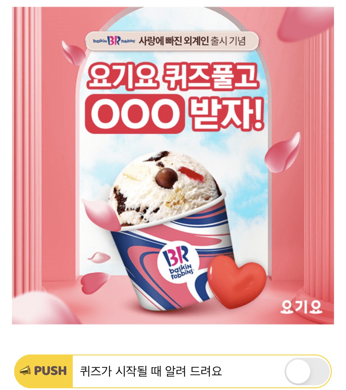 지금 요기요에서는 배스킨라빈스 신메뉴 사랑에 빠진 외계인 출시 기념으로 추첨을 통해 총 OOOO명에게 파인트를 드리는 퀴즈 이벤트가 진행되고 있어요!