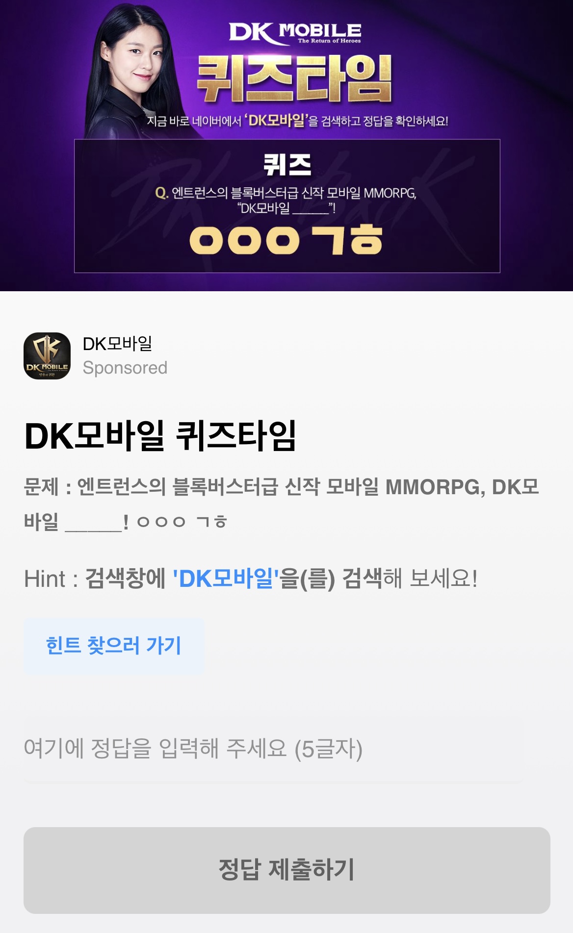 문제 : 엔트런스의 블록버스터급 신작 모바일 MMORPG, DK모바일 _____! ㅇㅇㅇ ㄱㅎ