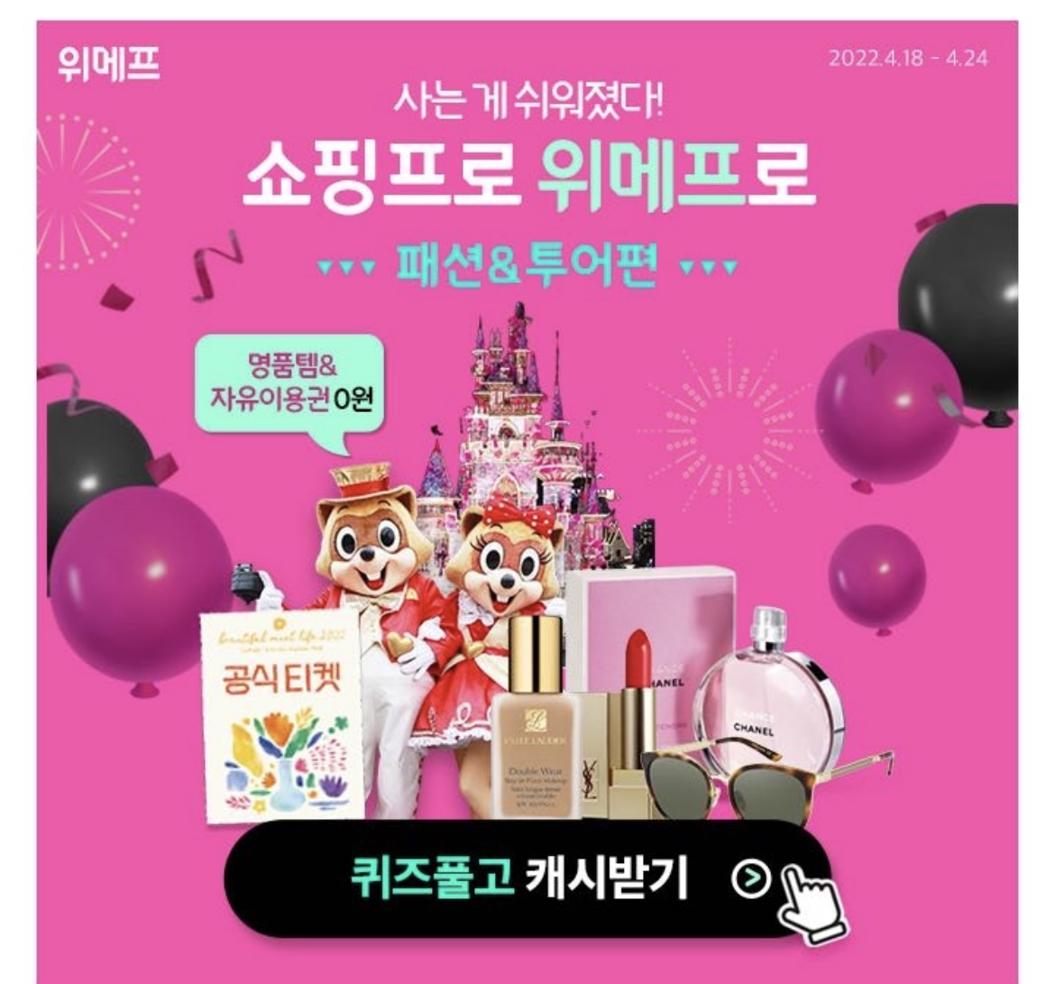 4월18일부터 24일까지 위메프에서 패션뷰티&투어컬쳐템 총 0원에 드립니다! 4월23일에 득템 가능한 상품은 OOO OO 라이프 2022 입장권 인데요! 빈칸에 들어갈 말은 무엇일까요?