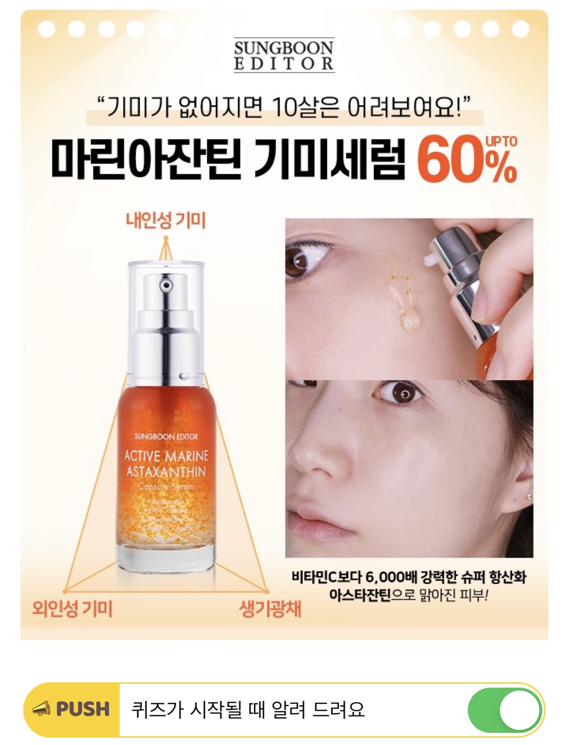 성분에디터 마린아잔틴 기미세럼은 비타민 C보다 6,000배 강력한 슈퍼 OOO 아스타잔틴을 함유하여 칙칙하고 푸석한 피부를 맑고 생기있게 만들어 줍니다. OOO에 들어갈 단어는 무엇일까요? (초성힌트: ㅎㅅㅎ)